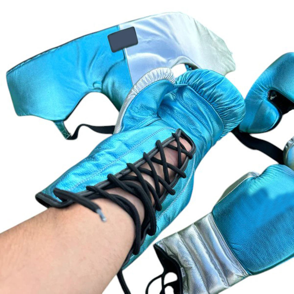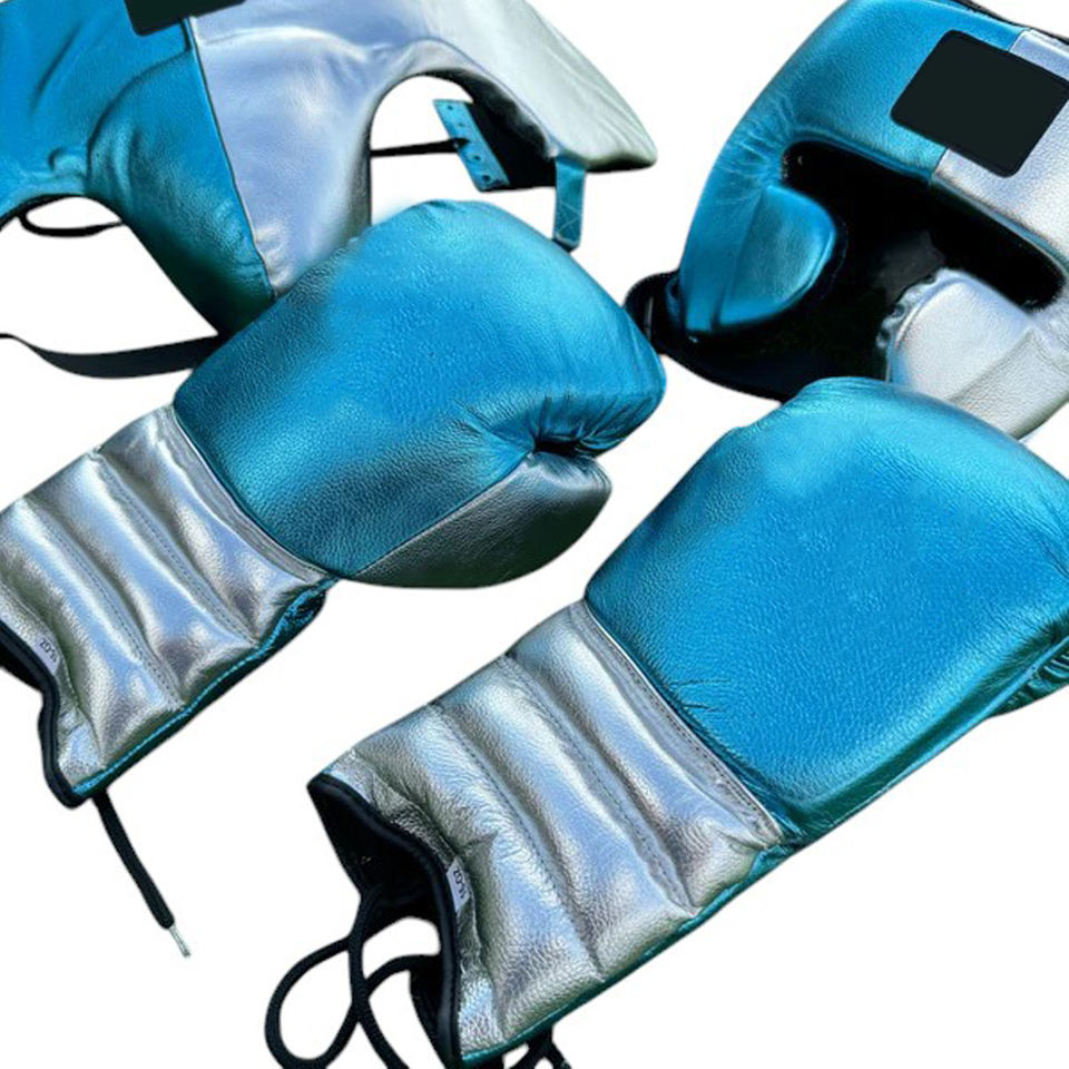 Ensemble de boxe en cuir de vache véritable, teinte bleue, très vendu, entièrement personnalisé, pour adultes, produit unique en cuir de boxe