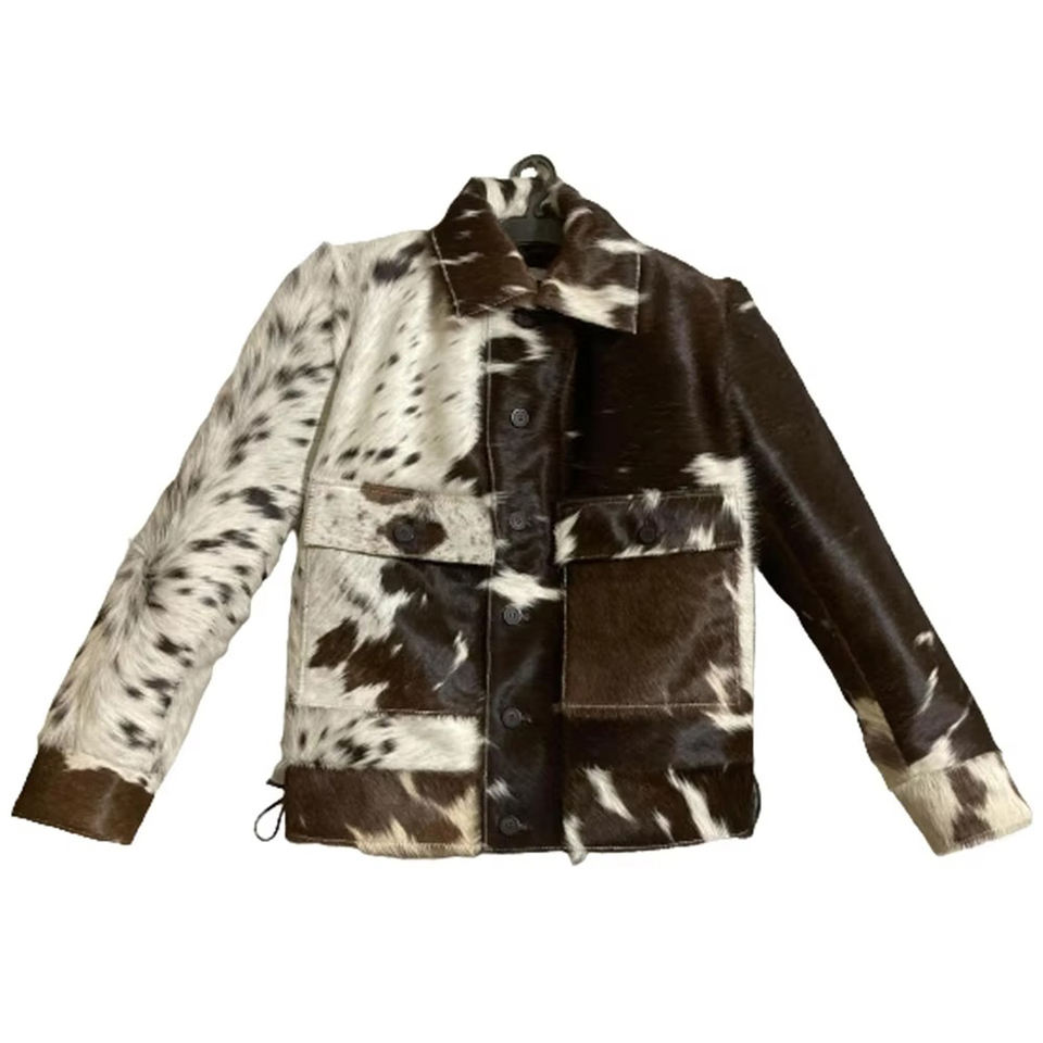 Veste en cuir de vache avec poils, style cowboy élégant, fourrure véritable, col montant en toile personnalisé, logo sur le devant, veste d'équitation pour hommes