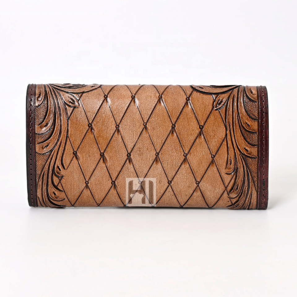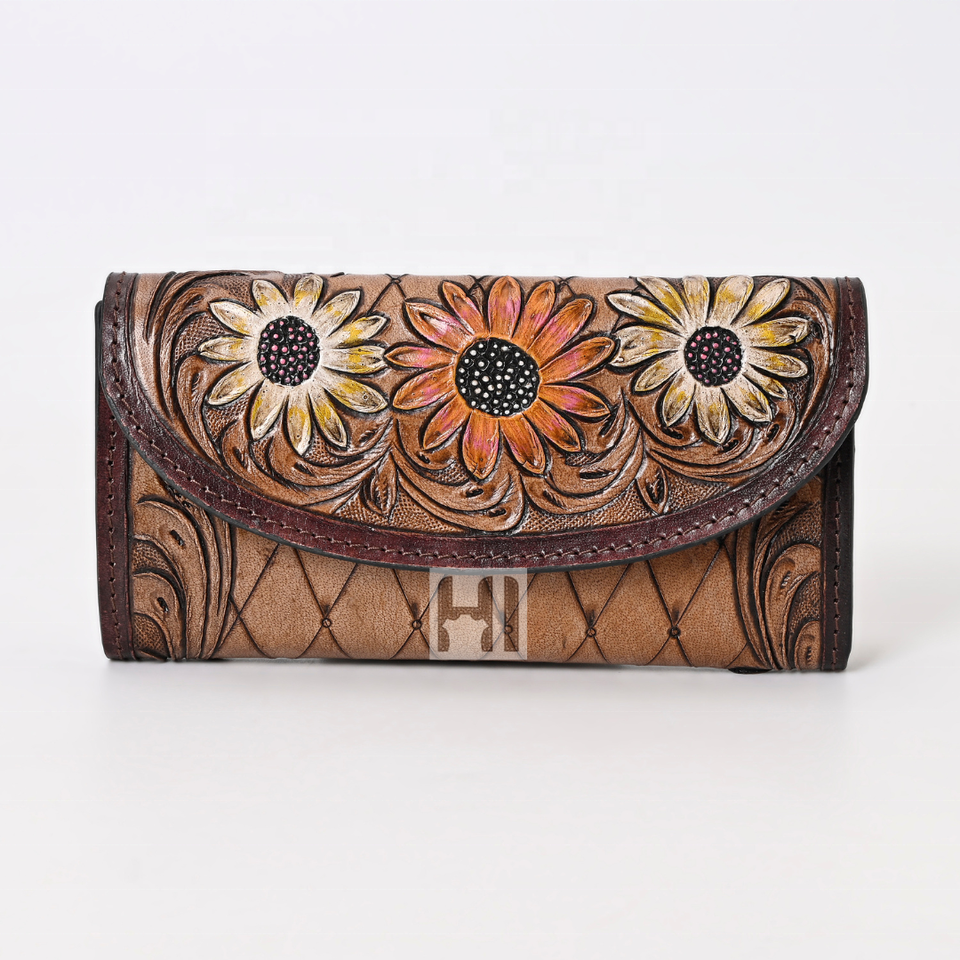 Portefeuille en cuir de vachette pour femmes Vintage Western Fashion Trifold avec RFID longue longueur luxe outillage à la main sculpture OEM disponible