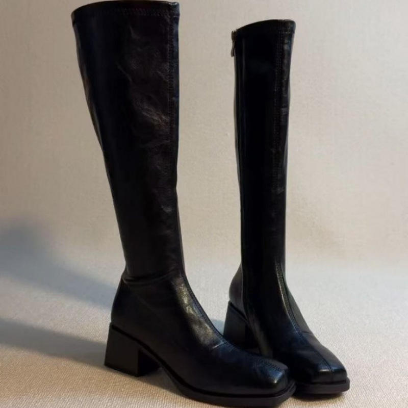 Version en cuir de vache ~ Nouvelles bottes hautes à talon moyen de style britannique en cuir véritable pour femmes, bout carré, fermeture éclair latérale, bottes de cavalier sous le genou