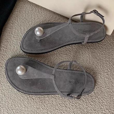 Version en cuir de vache ~ Sandales plates à bride T en cuir véritable avec perle blanche australienne élégante et polyvalente pour femmes