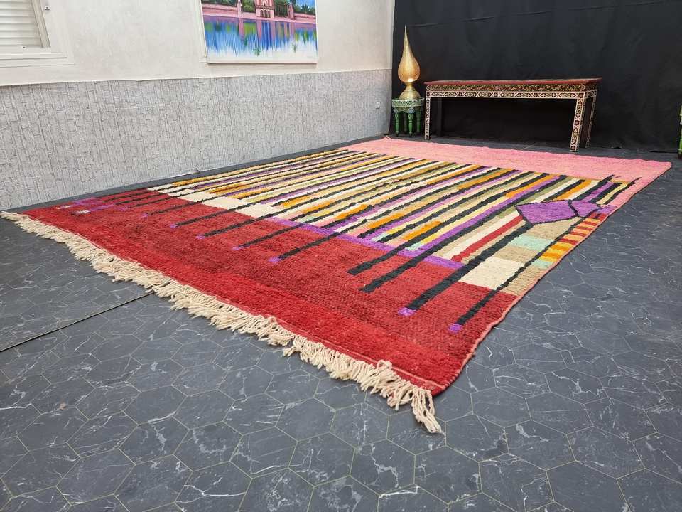 Tapis Boujaad rayé confortable 10x12, tapis berbère marocain fait à la main, tapis vintage en laine coloré bohème, rose rouge, salle de bain, cuisine