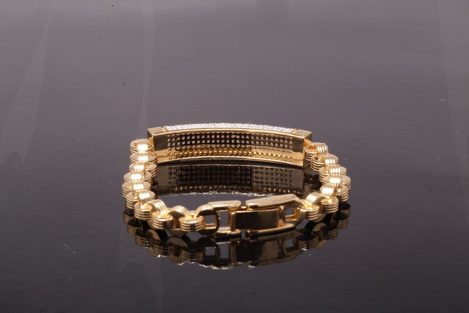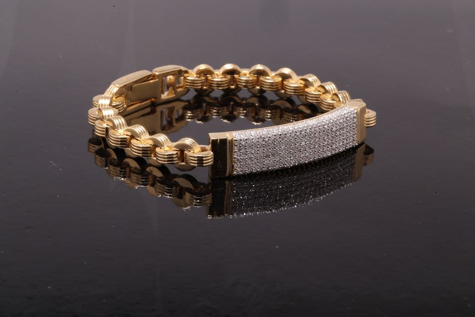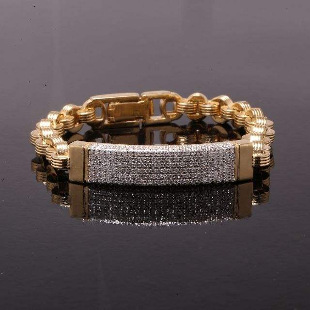 Fabriqué dans le style Hip Hop, ce bracelet cubain pour homme comprend de l'or jaune 14 carats orné de diamants de laboratoire de taille personnalisée.