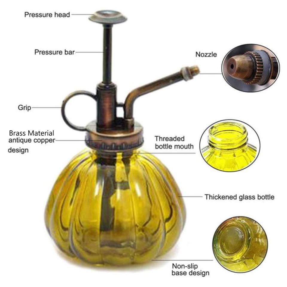 Brumisateur de plantes en verre jaune de style vintage avec pompe en métal idéal pour le jardinage intérieur et la décoration intérieure et une solution d'arrosage facile