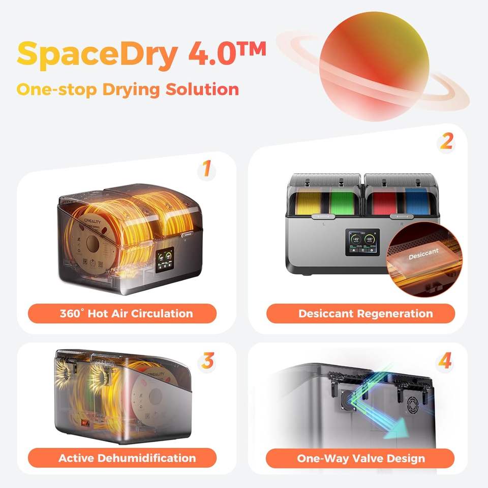 Séchoir à filament Creality SpacePi X4, 4 bobines, double chauffage indépendant, température maximale 85°C, machine de séchage du plastique