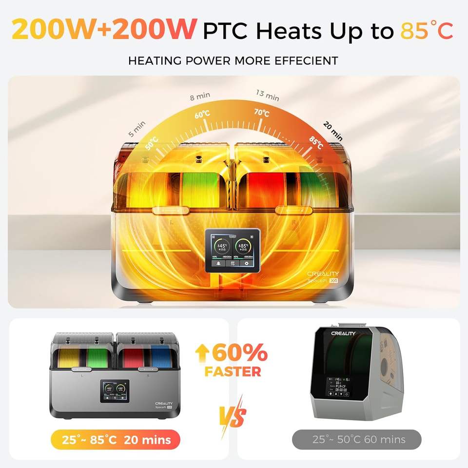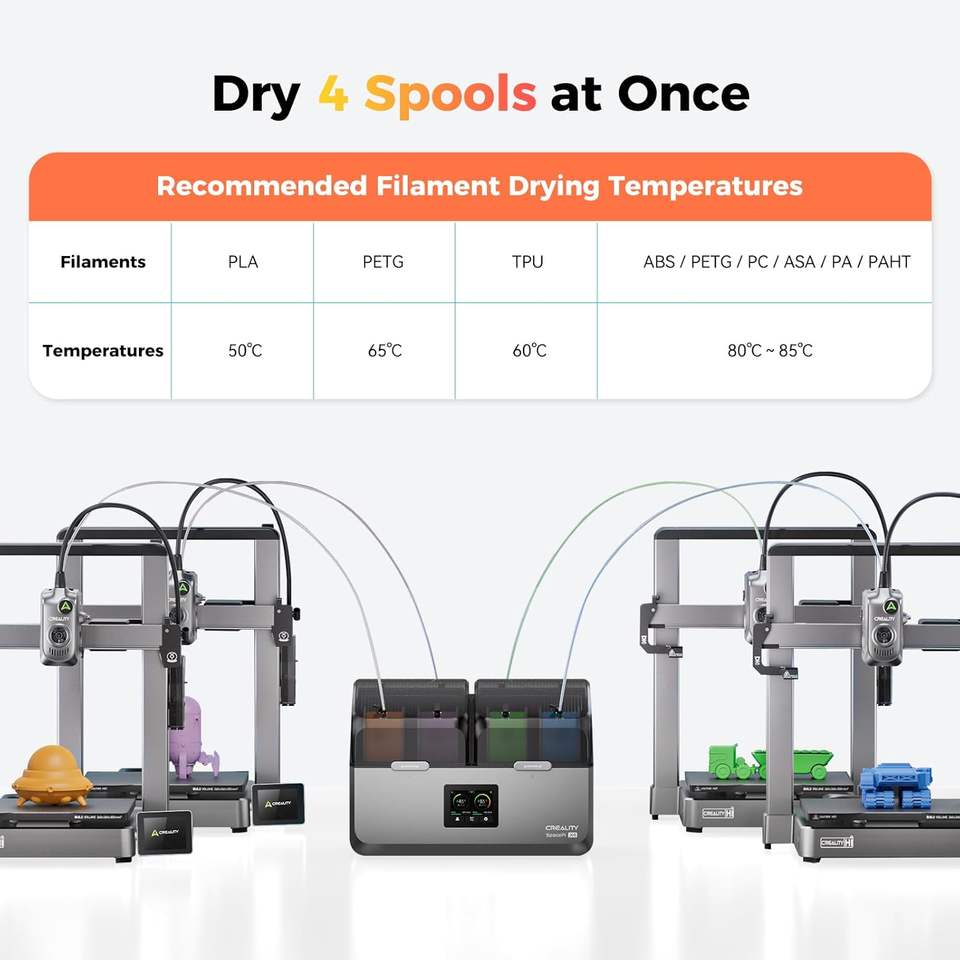 Séchoir à filament Creality SpacePi X4, 4 bobines, double chauffage indépendant, température maximale 85°C, machine de séchage du plastique