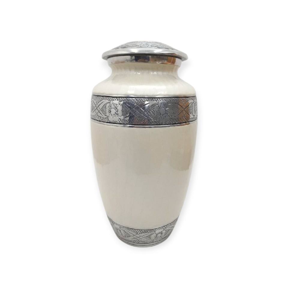 Urne funéraire en métal de couleur crème avec symbole de croix et bordure détaillée pour le stockage des cendres commémoratives
