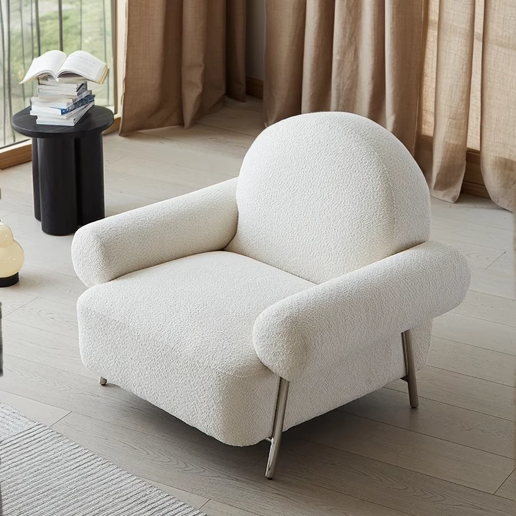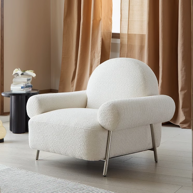 Fauteuil simple de couleur crème, forme ronde, rembourrage en mousse, style moderne minimaliste, salon, balcon
