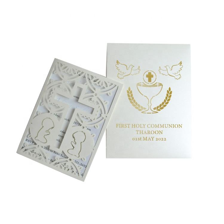 Carte d'invitation de première communion de croix découpée au laser avec boîte d'invitation de calice de baptême personnalisée