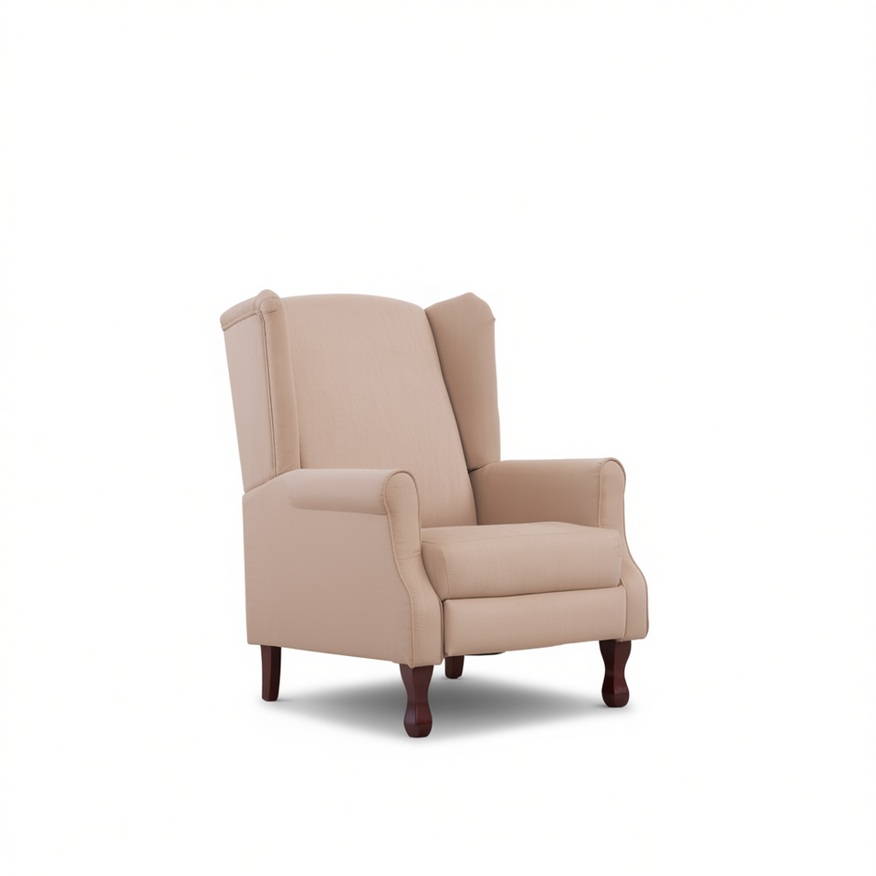 Fauteuil inclinable à dossier haut en tissu polyester crème, structure en bois, commande manuelle, style traditionnel, pour salon