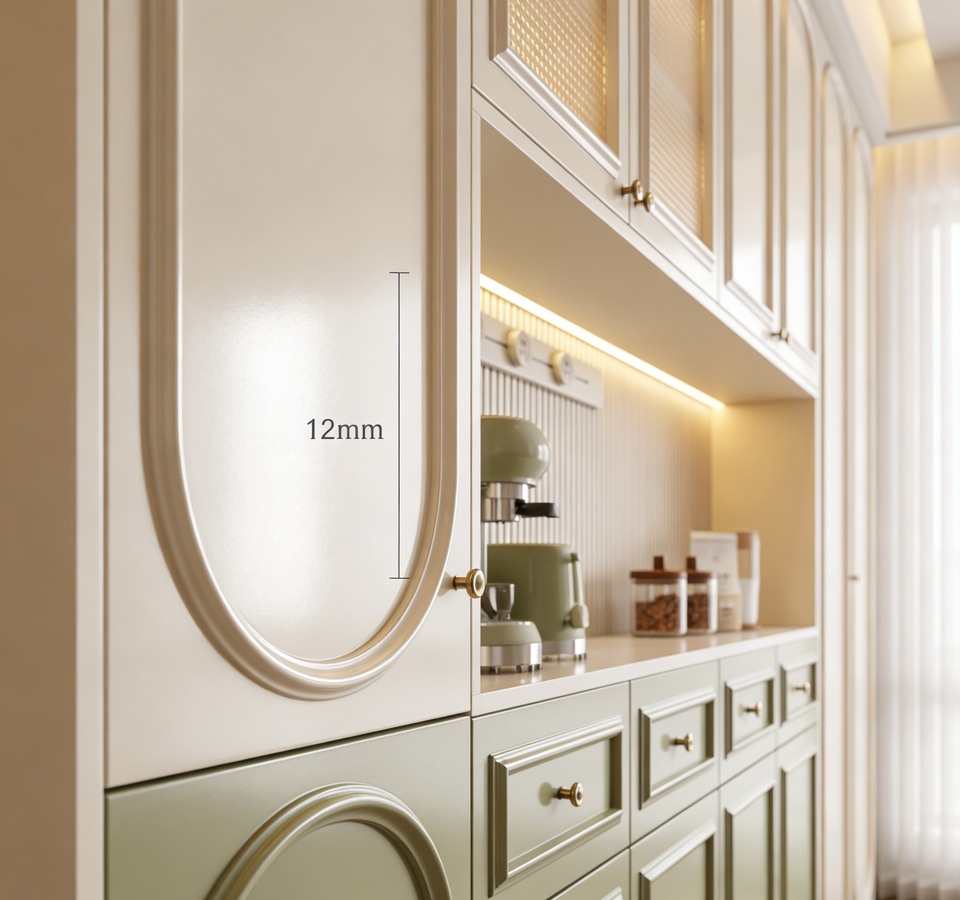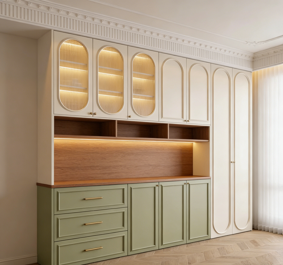 Armoire intégrée vert crème et vert sauge - Panneau arqué et éclairage LED, coin barista multifonctionnel pour chambres élégantes