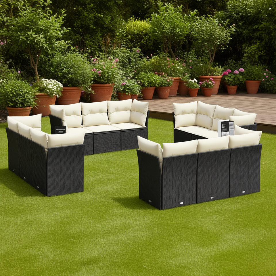 Ensemble de salon de jardin en rotin blanc crème et noir, 10 places, mobilier d'extérieur, design contemporain