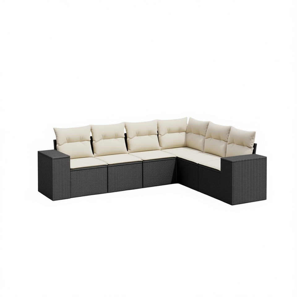 Ensemble de salon de jardin en rotin blanc crème et noir avec coussins, 6 places, mobilier d'extérieur, design contemporain