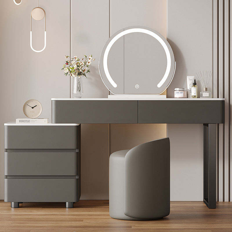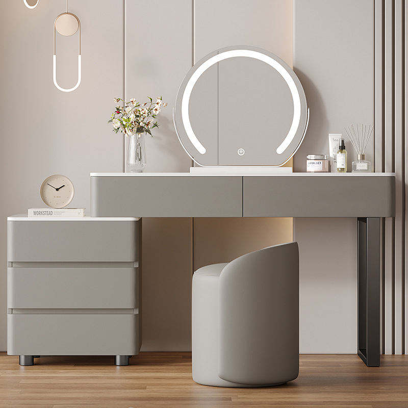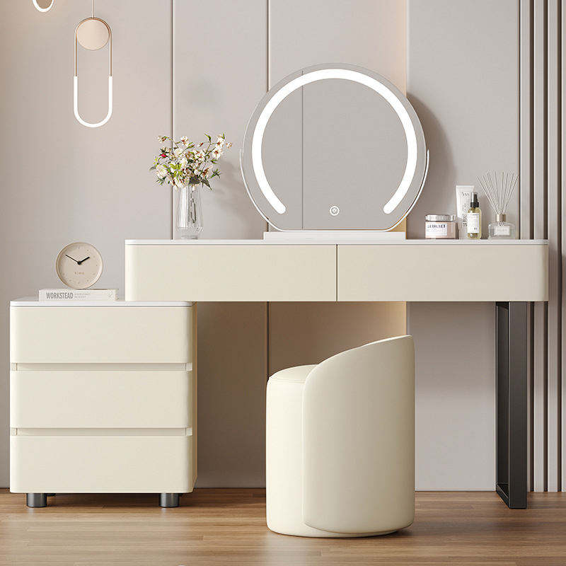 Ensemble de coiffeuse en bois blanc crème, coiffeuse moderne en cuir avec miroir, design simple, commode de rangement, idéal pour les adultes