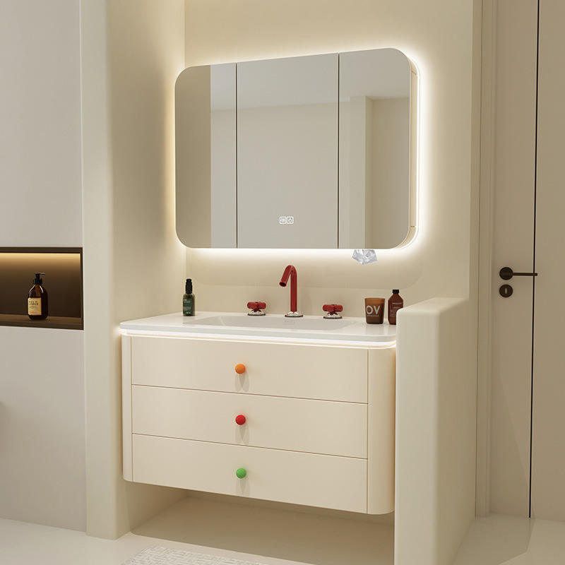 Miroir intelligent mural avec éclairage LED, grande capacité de rangement, vasque intégrée en céramique et armoire de salle de bain.
