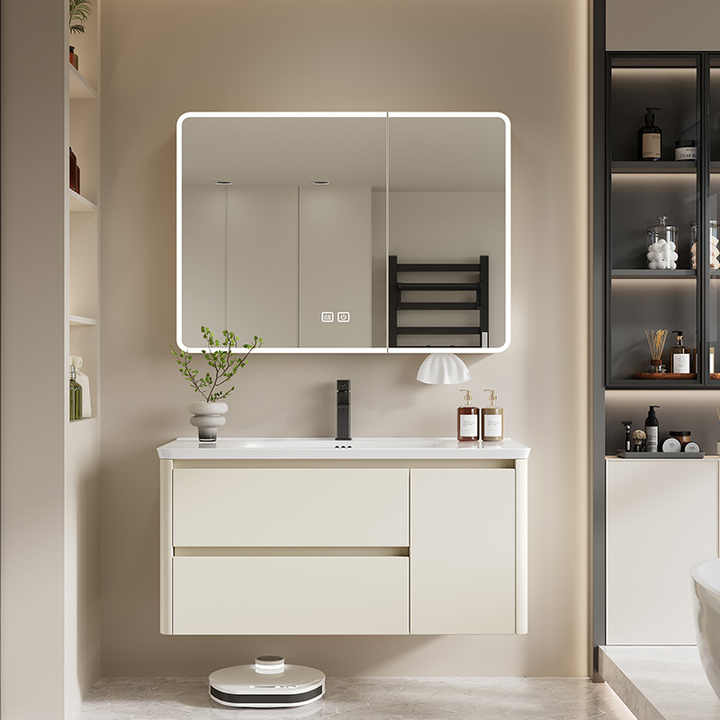 Meuble de salle de bain mural en bois massif, résistant aux intempéries, avec miroir LED intelligent anti-buée et vasque intégrée en pierre.