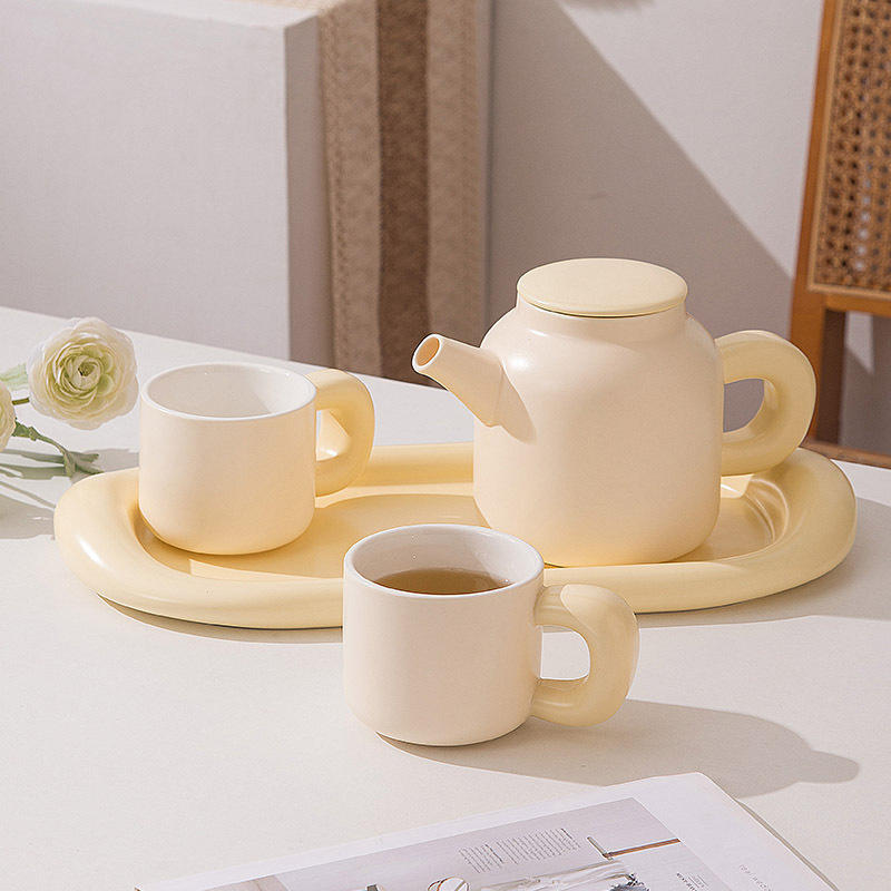 Service à thé en céramique crémeuse avec théière et deux tasses pour la maison et les cadeaux