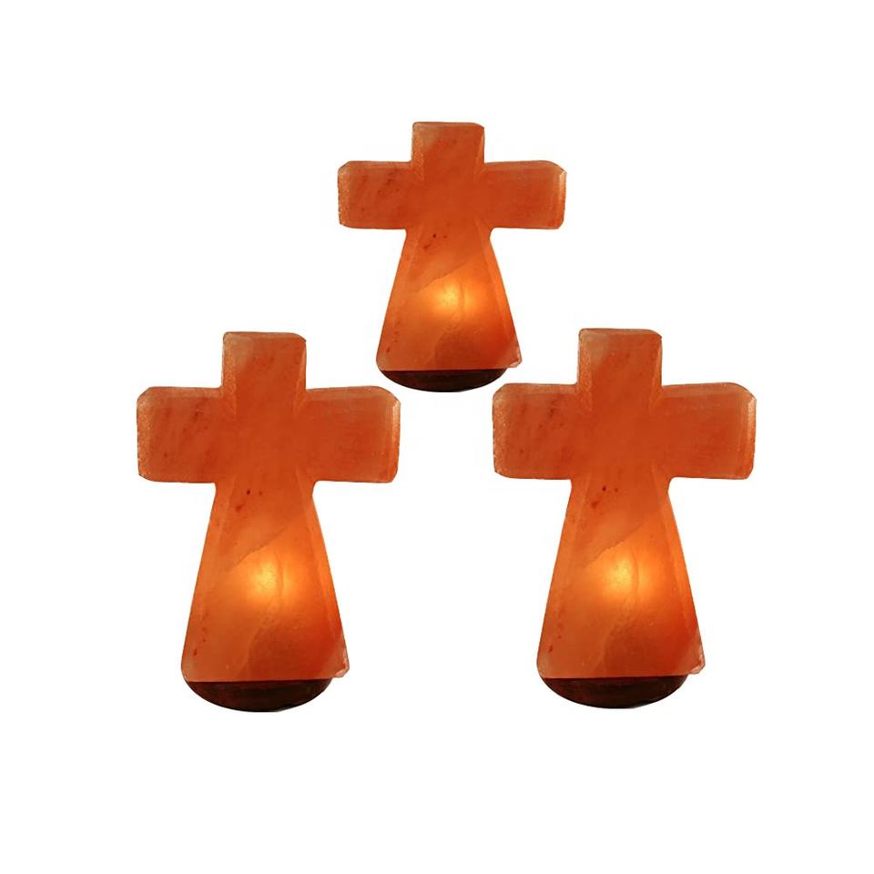 Lampe de sel de l'Himalaya en forme de croix, lumière naturelle nocturne.