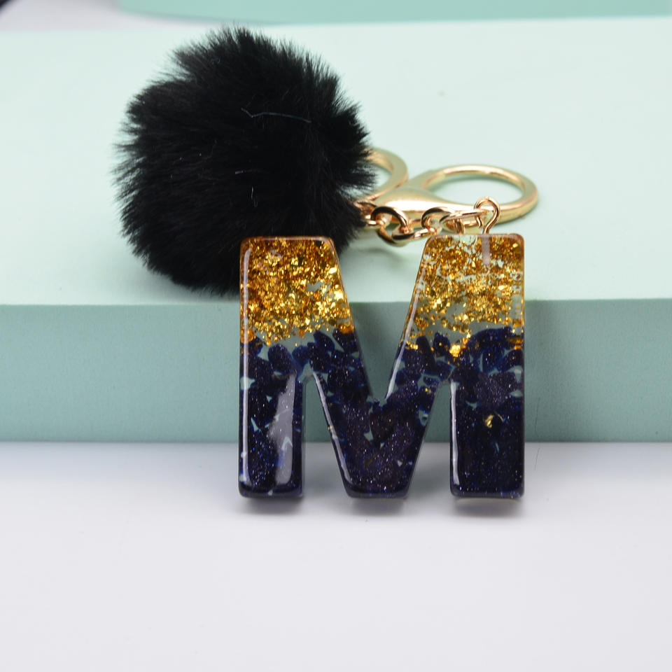 Porte-clés à pompons boule noire créative, sacs porte-clés de voiture A-Z lettres porte-clés en résine époxy