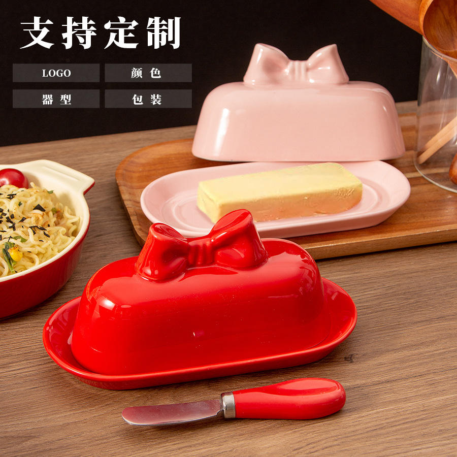 Plat à beurre en céramique créatif avec nœud papillon, ovale, avec couvercle, rouge, 16,5 cm, vaisselle de cuisine, style nordique