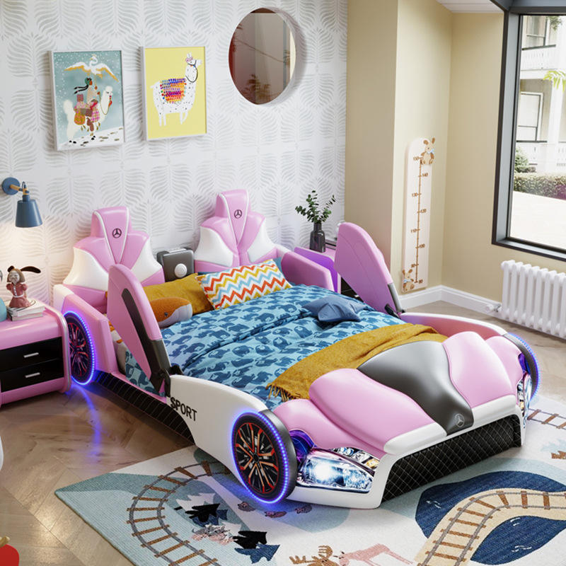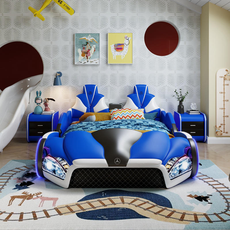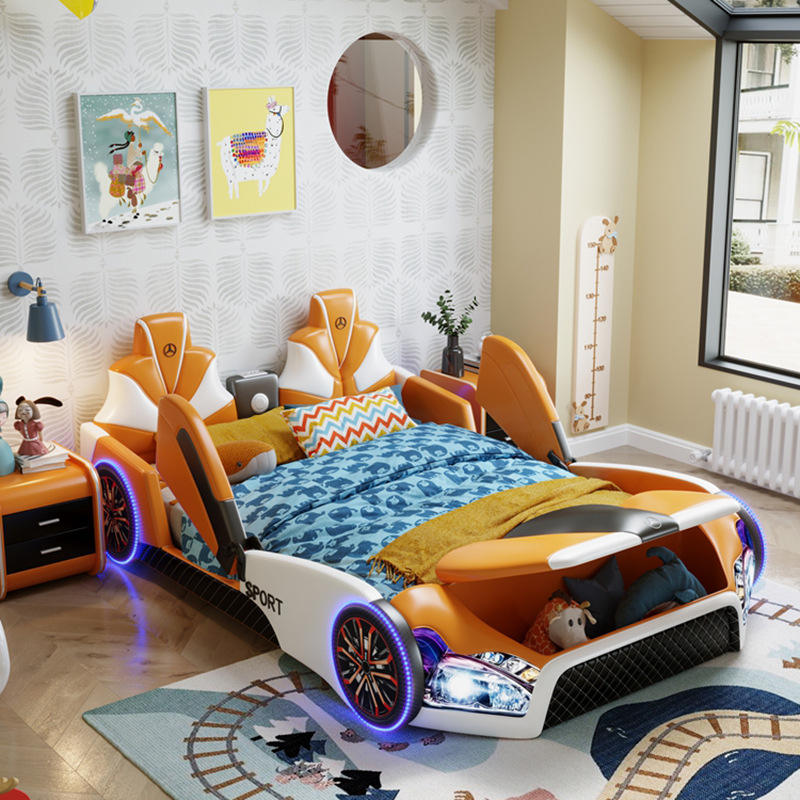 Lit enfant créatif en forme de voiture avec rangement pour chambre à coucher, taille simple, design sport, aspect cuir orange