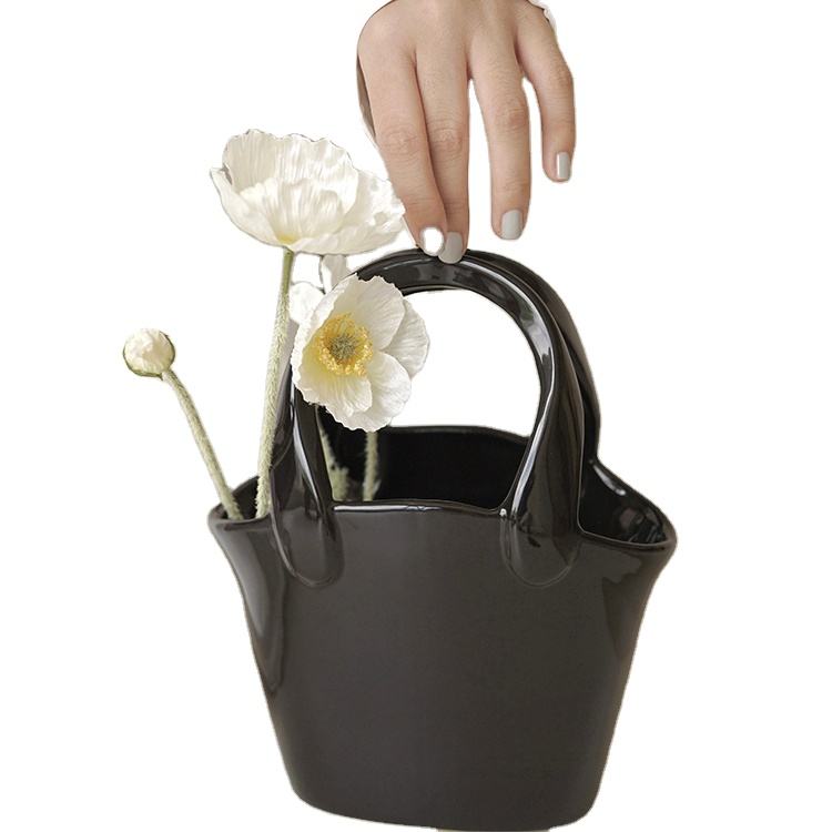 Sac à main créatif en céramique, Vase de fleurs en forme de panier, Pot de fleurs noir brillant, décoration de la maison, améliore la qualité de votre ascenseur