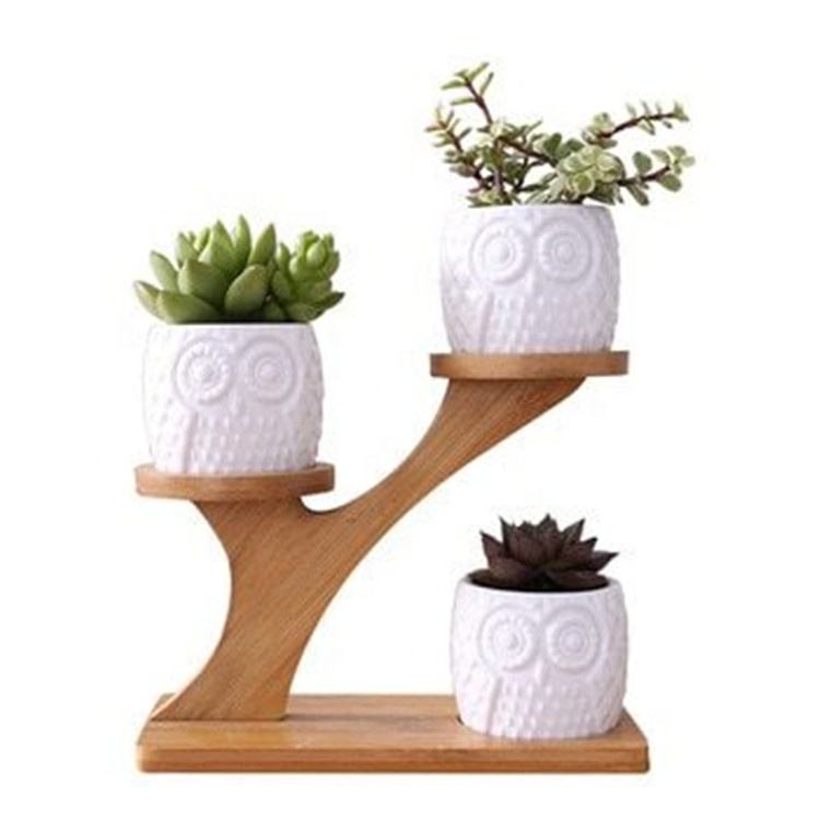 Creative designs cheap home decor ceramic mini owl planter / flower pot with wooden shelf