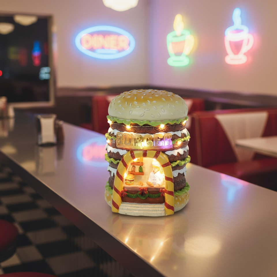 Décoration de Noël Animée Créative et Amusante en Résine LED en Forme de Burger, Personnalisable avec 8 Mélodies Musicales, Idéale pour Cadeaux d'Intérieur