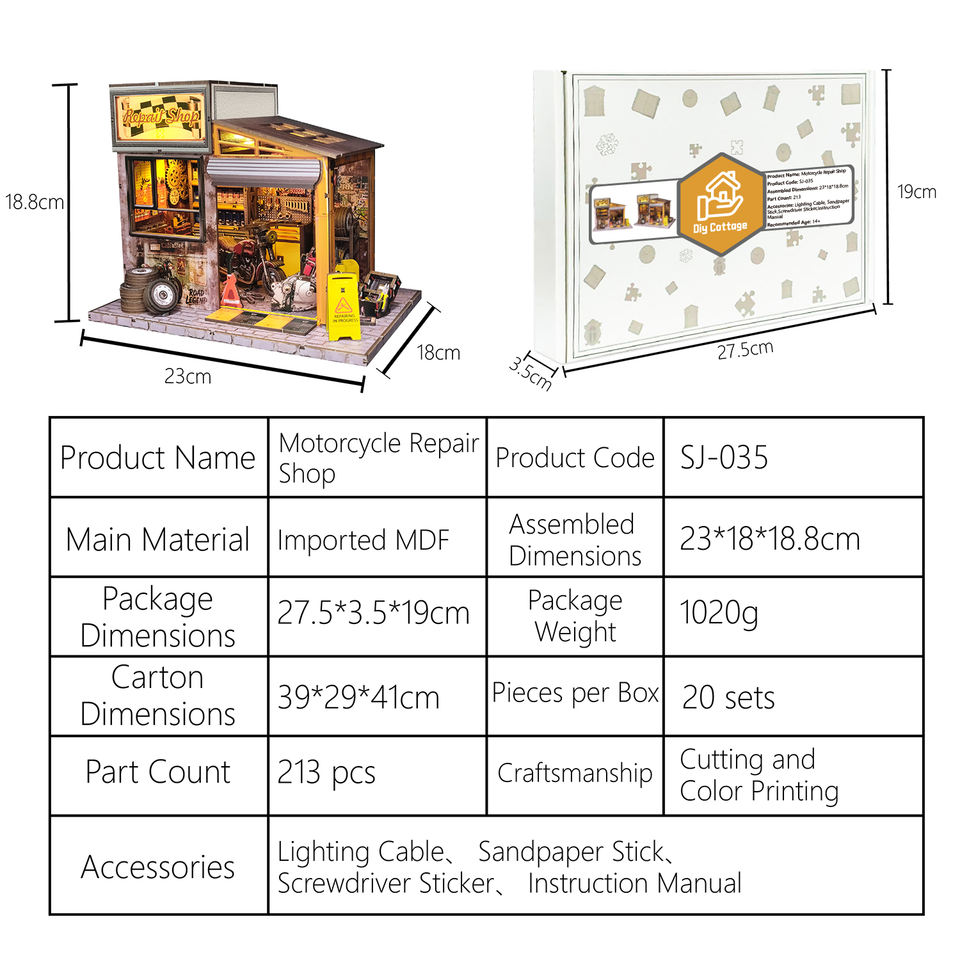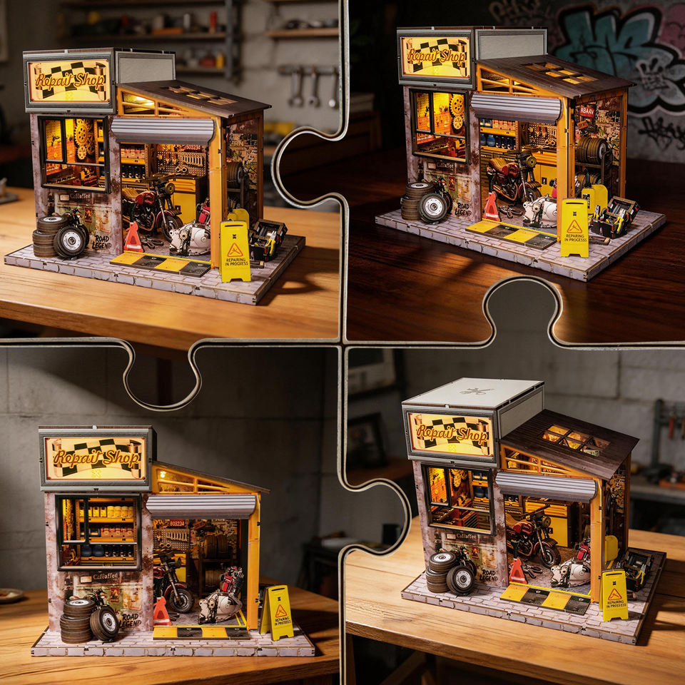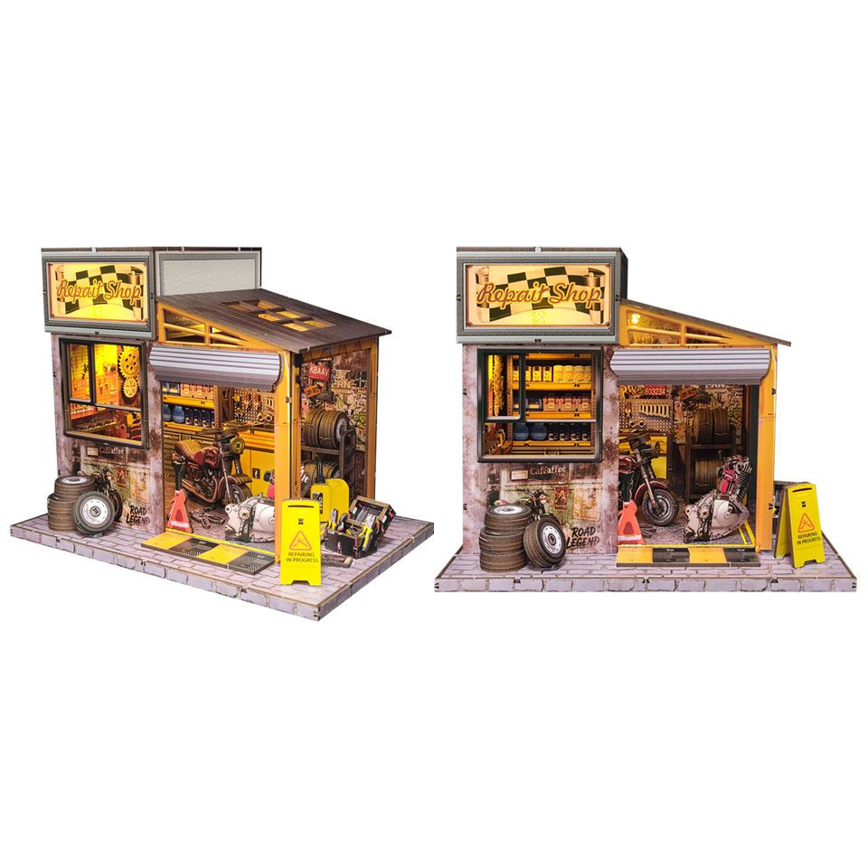 Idée cadeau créative : Maison de poupée en bois sur le thème de l'atelier de réparation automobile, kit miniature lumineux et mobile, jouet éducatif de construction DIY