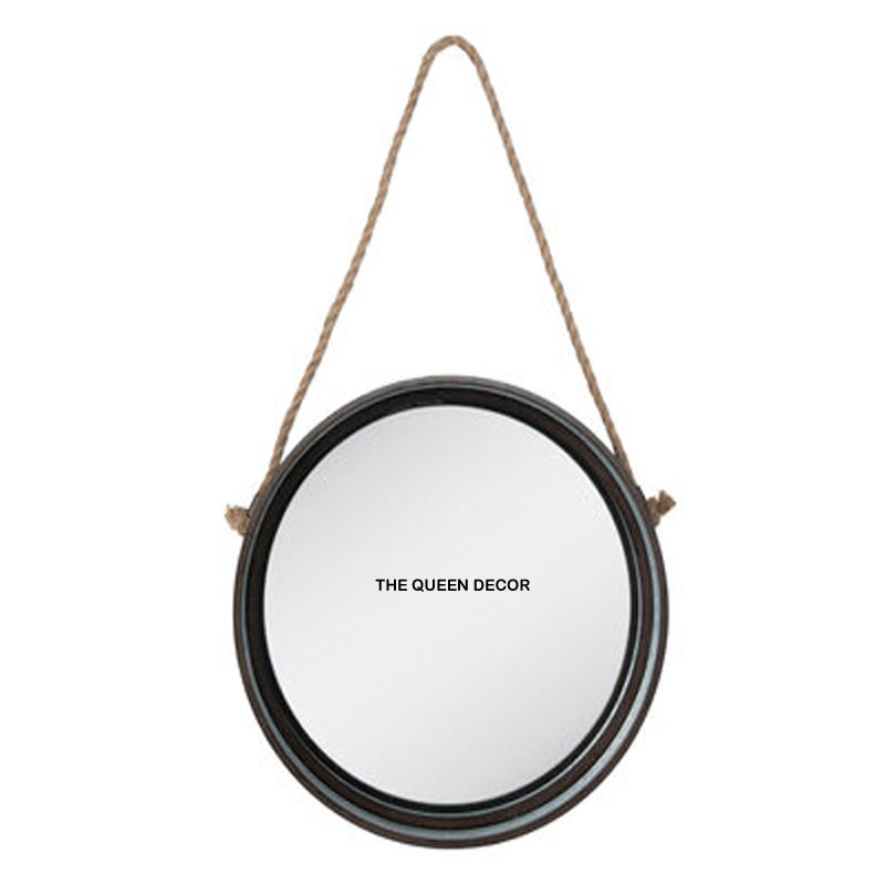Miroir mural décoratif rond en aluminium artisanal, finition noire, avec poignée en corde