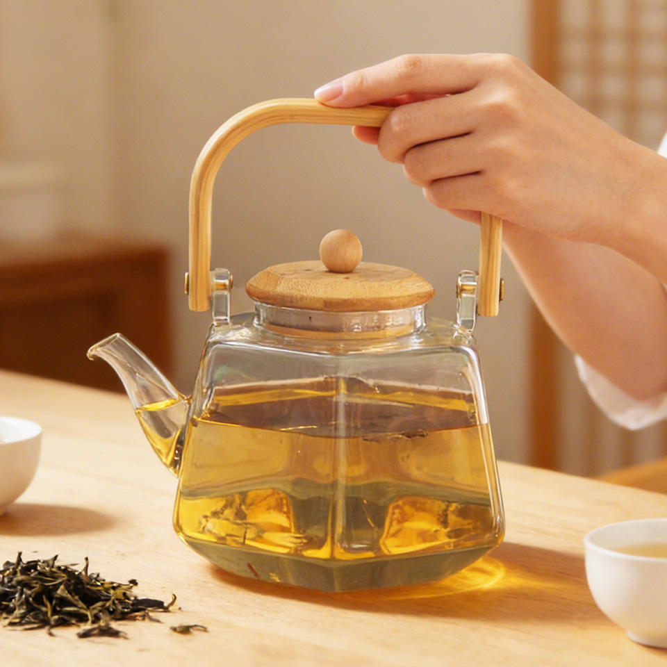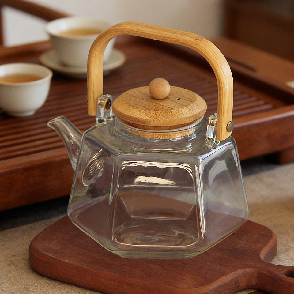 Théière en verre hexagonale créative, résistante à la chaleur, compatible avec les cuisinières, pour faire du thé ou du café, avec poignée et couvercle en bambou