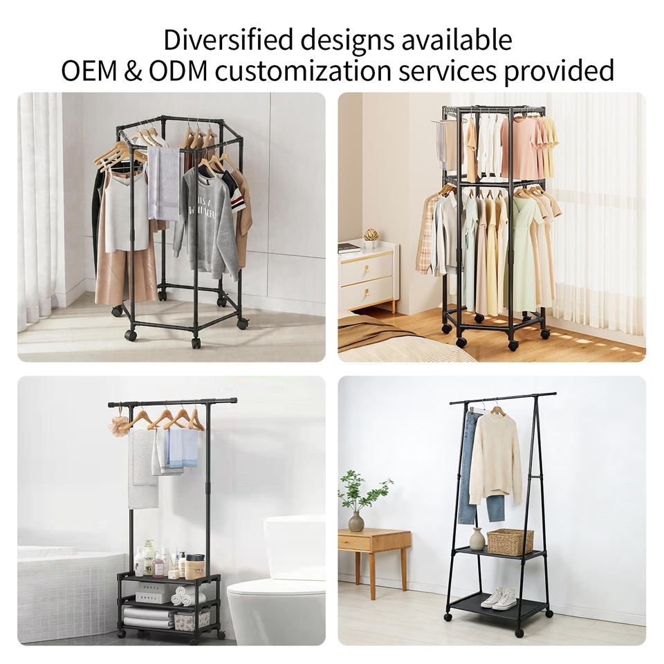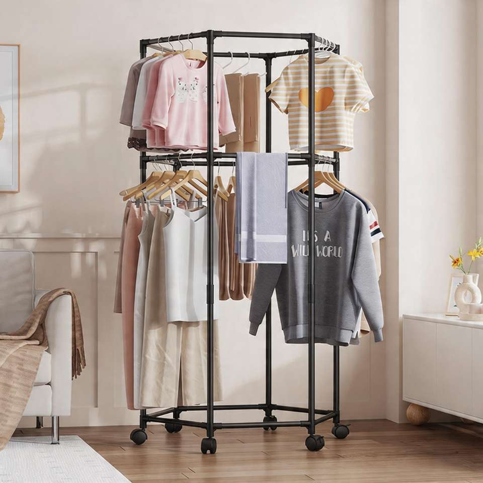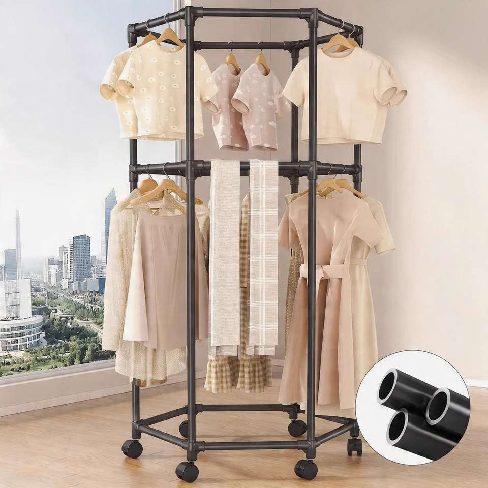 Porte-vêtements hexagonal créatif, mobile, double couche, grande capacité, en métal, sur pied, avec roulettes