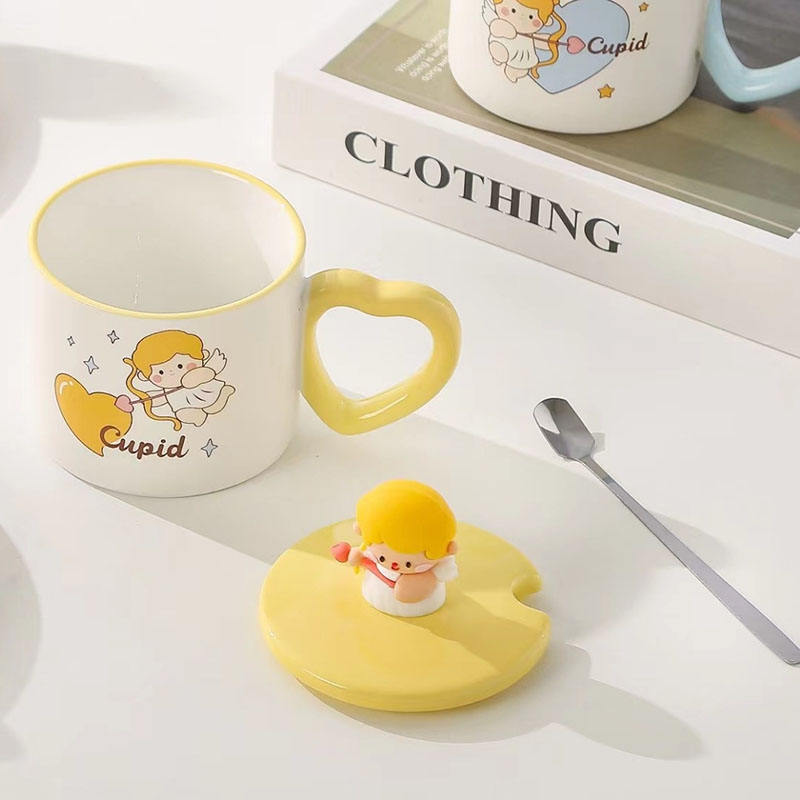 Tasse créative à poignée en forme de cœur creux Tasse Cupidon mignon avec couvercle cuillère