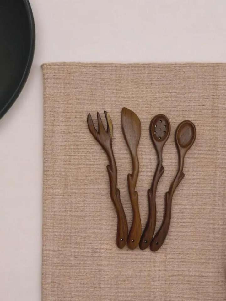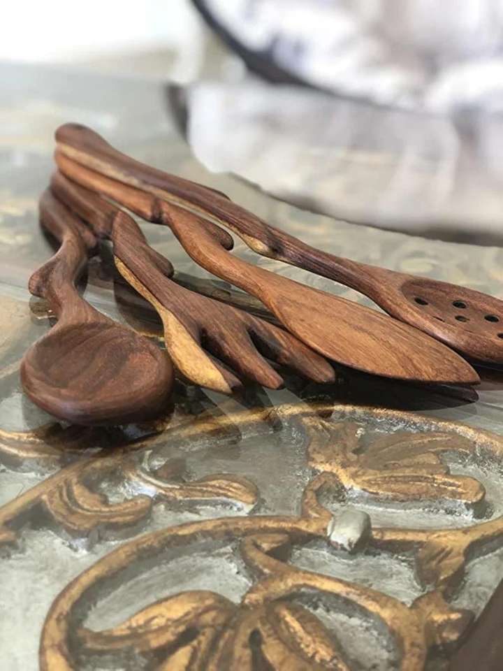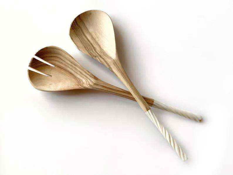 Outil à salade en bois de hêtre à poignée triangulaire créative à long manche en remuant la fourchette à gâteau Dim Sum