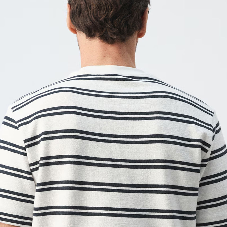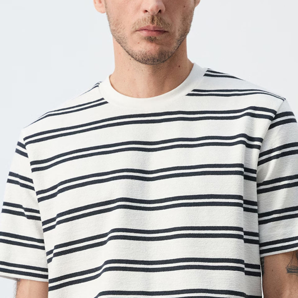 T-shirt rayé à col rond coupe classique avec logo personnalisé, ouverture au dos, manches courtes, ourlet droit, couleur unie 2026