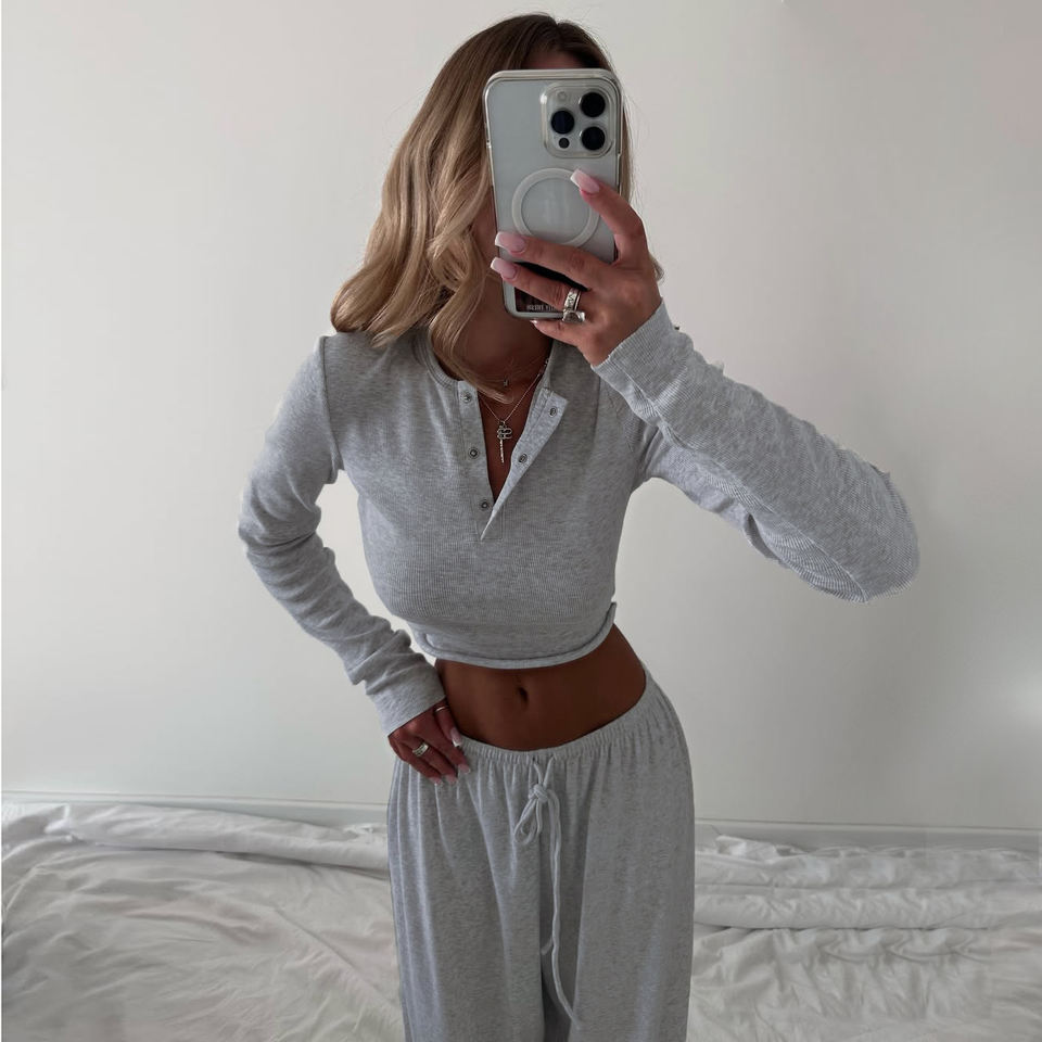 Crew neck button long-sleeved short T-shirt High-waisted oversized straight-leg trousers Seamless edge minimalis two-piece set