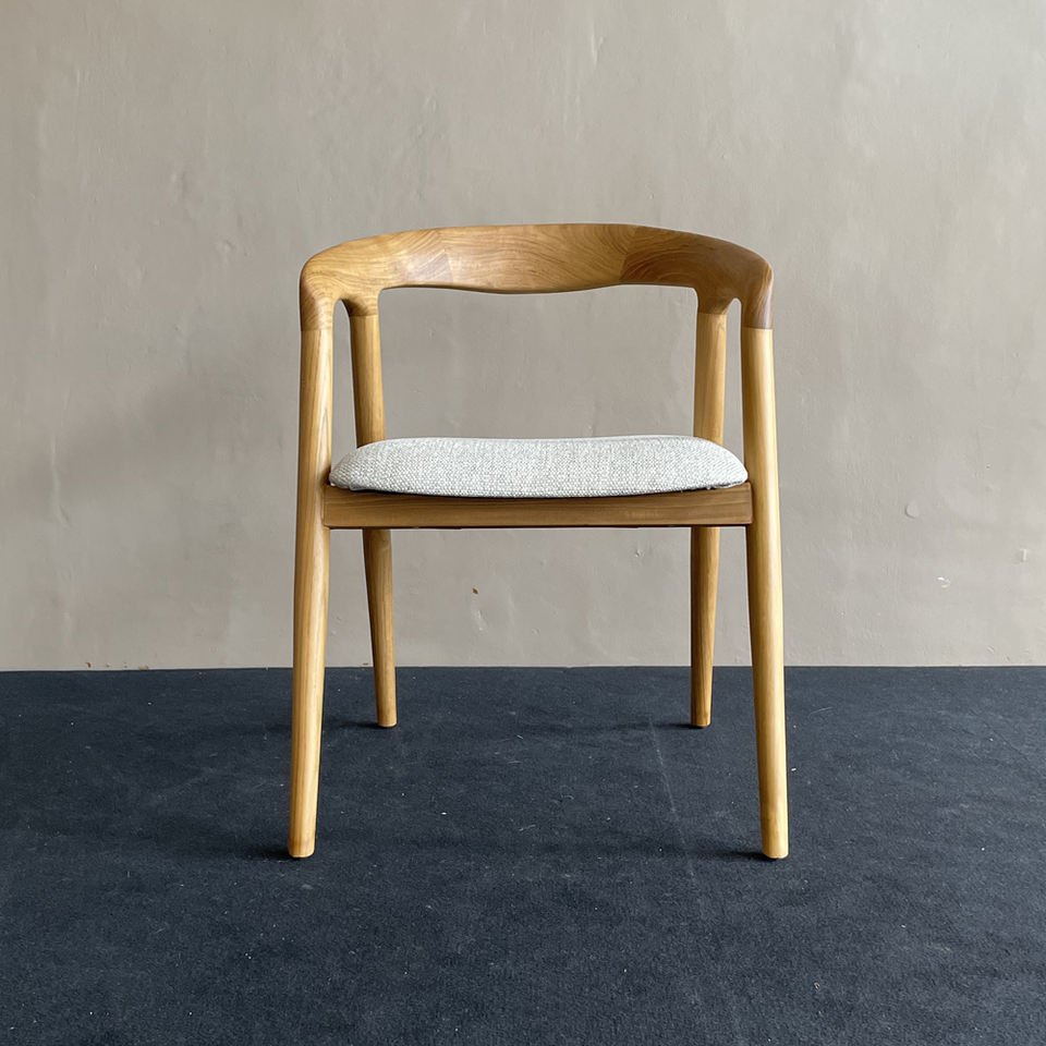 Chaise Crey fabriquée en bois de teck massif avec finition NC et tissu d'intérieur réfléchissant le style japonais naturel et chaleureux