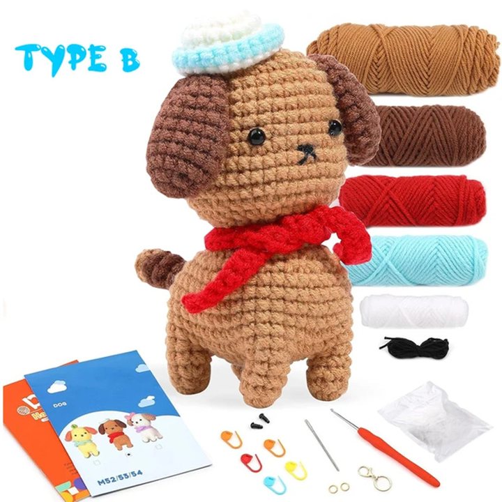 Kit animal au crochet Fil facile pour chiot brun Poupée Amigurumi DIY Crochet Jouets Kit d'artisanat fait main avec tutoriel étape par étape