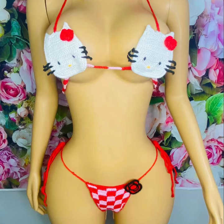 Crochet Brand Women's Eco-Friendly Woolen Above Knee Short Sleeve Bikini Set Summer Sexy Bathing Cat Thong Swimsuit