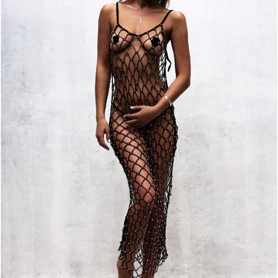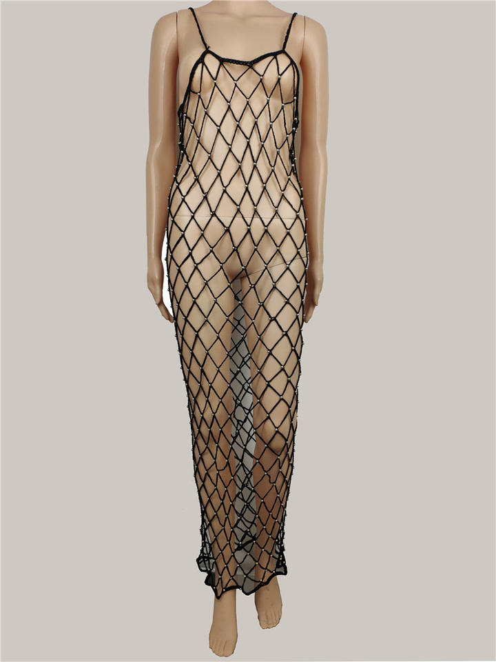 Robe de plage longue en crochet ajouré avec perles brillantes, cache-maillot de bain, paréo, tenue de plage pour femme