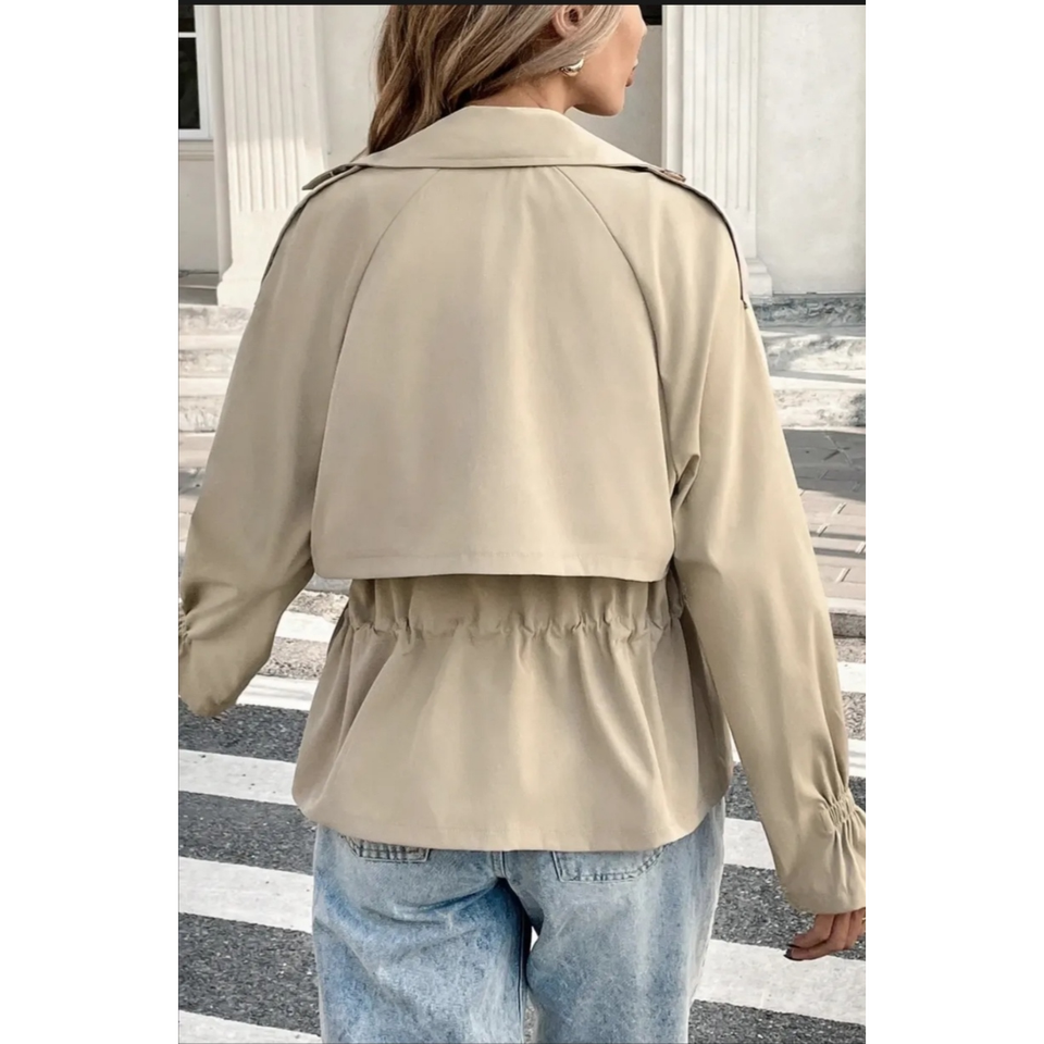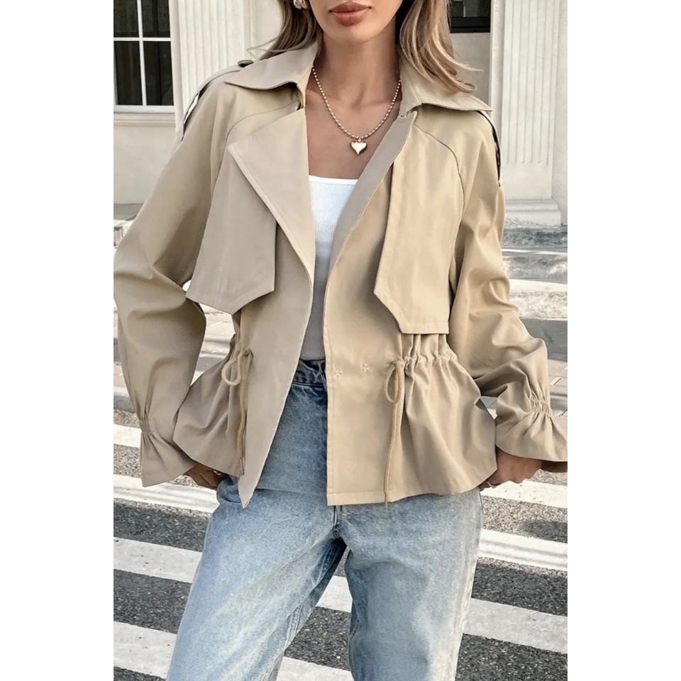 Veste trench courte à cordon de serrage ou parka utilitaire cintrée, style streetwear contemporain, décontracté chic, col inspiré du trench classique