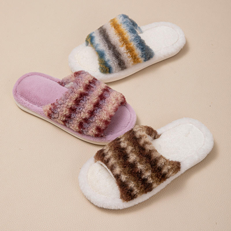 Pantoufles en coton rayées et colorées pour femmes, pantoufles en fourrure avec un design confortable, pour l'exportation