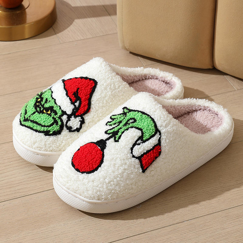 Chaussons d'hiver confortables pour hommes et femmes, motif dessin animé mignon Grinch, style fourrure, semelle extérieure en TPR, pour la maison