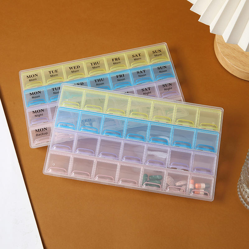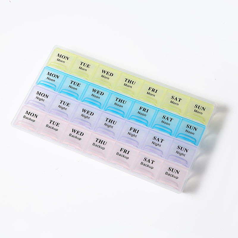 Boîte à pilules hebdomadaire portable transfrontalière en plastique, 7 jours, 28 compartiments, matin, midi, soir, rangement, logo personnalisé, grande capacité