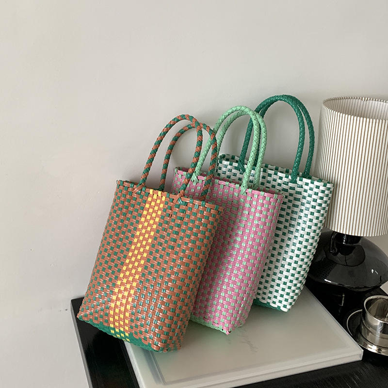Sac d'été en PVC tissé à la main décontracté fourre-tout style dame manipulé panier couleur-bloc tissé plage cadeau panier doublure en tissu