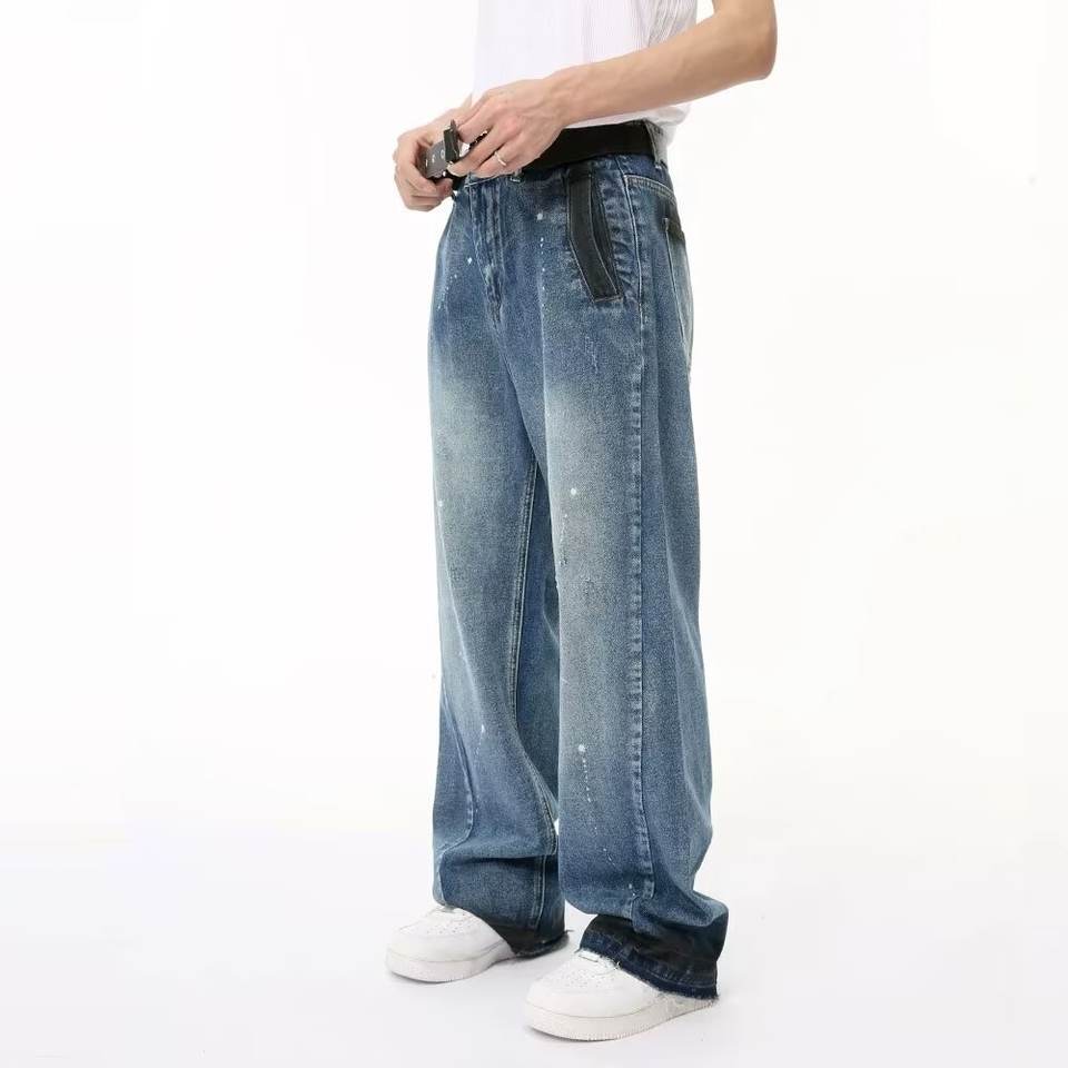 Jeans en denim délavé bleu à effet encre éclaboussée, coupe droite ample, style rétro américain, pour homme, printemps, tendance transfrontalière, style streetwear