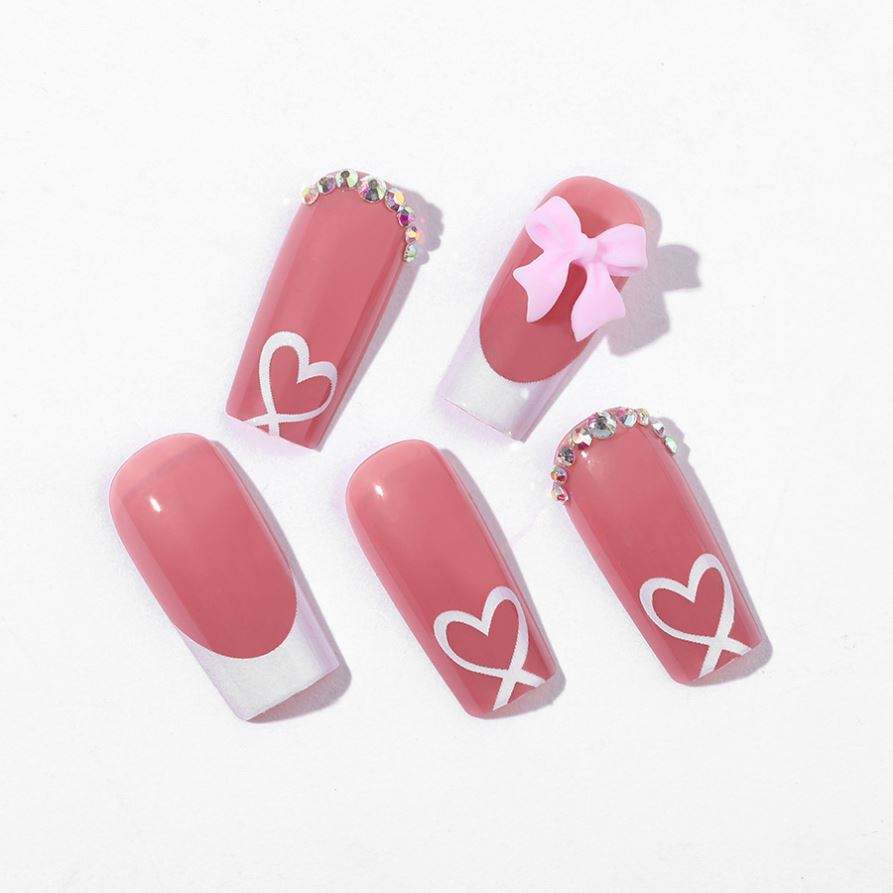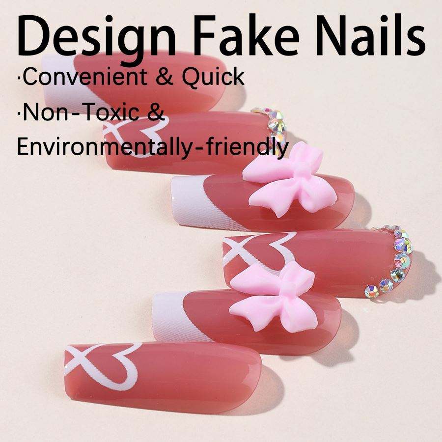Cross-border Handmade Wear armor Wholesale 24 Pieces Mid-length Nail Tip love Heart Bow Tie French Fake Nails Nail Sticker