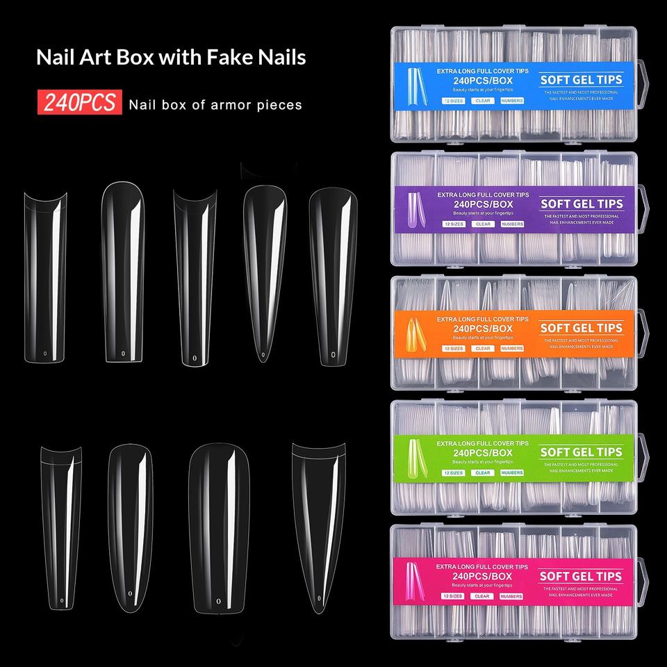 Faux ongles en gel souple extra longs pour nail art transfrontalier, patchs d'ongles en gel transparent à coller, 240 pièces en boîte, taille XXXL, denim, vente en gros