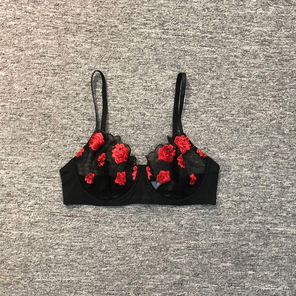 Cross-border Russian Flaming Red Lip Sexy Underwear Tulle Transparent Three Point Ultra Thin Cup Light Control Half Bra Set