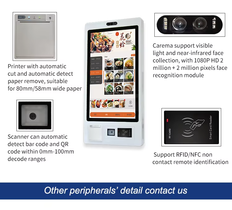 optional parts:A4 Printer, Barcode Printer, Barcode Reader, Camera, Card Reader, Electric Card Reader, Fingerprint Scanner, IC Card Reader, MSR, Pos Solution, QR Code Scanner, Scanner